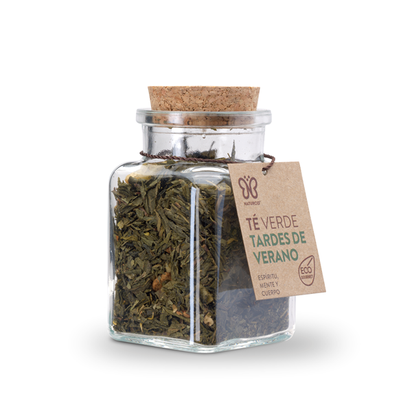 Ingredientes: Té* verde, trozos de plátano* (plátano*, aceite de coco*, azúcar* de caña cruda, miel*), trozos de manzana*, aroma natural, trozos de fresa*, flor de caléndula*. *Procedente de agricultura ecológica.