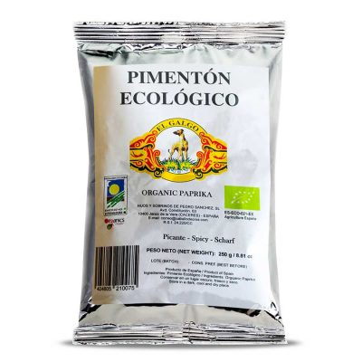 El pimentón ecológico El Galgo posee un sabor muy especial, muy original (no es ahumado) y de grandísima calidad. En este caso evidentemente se trata de un pimentón procedente de pimenteros tratados sin herbicidas, pesticidas y cultivados de forma totalmente ecológica, por supuesto poseen el sello de garantía de producto ecológico extremeño. Las bolsas de pimentón ecológico poseen el formato ideal tanto para el consumo personal y familiar como para hostelería (Muchos de los mejores restaurantes ya lo usan).