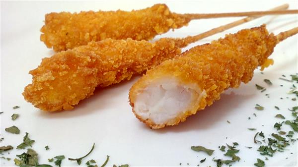 Langostino al ajillo con un fino y empanado de ajo y guindilla.