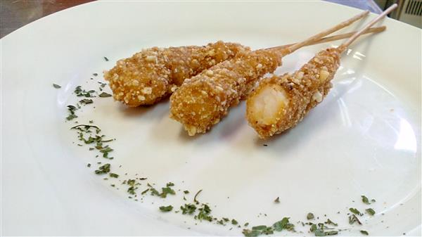 Crujiente langostino entero marinado con cobertura de maíz tostado y molido.