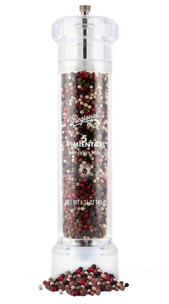 Los molinillos PREMIUM de Regional Co. tienen un elegante diseño de cuerpo acrílico transparente con metracrilato en la parte superior que le da el punto de calidad gourmet que tanto te gusta.Con su mecanismo cerámico ajustable de molido uniforme puedes repartes exquisitas especias a los que te acompañen en tu mesa. Porque el aroma y el sabor del grano recién molido no tiene precio. Y es que los Molinillos PREMIUM de Regional Co. son la creme de la creme y todos van a querer tenerlo en casa!!! Este nuevo formato te permite que puedas disfrutar a diario de la elegancia y de lo exquisito en un recipiente de máxima calidad, resistente y de larga duración que además puede ser rellenado.Los Molinillos PREMIUM de Regional Co. son la pieza clave para todos los que quieren marcar la diferencia.Di sí a la riqueza del aroma y del sabor con la exclusividad de lo instantáneo ¿Por qué conformarte con 1 si puedes tener 5 en un único movimiento de molinillo? La pimienta, una de las especias más utilizadas por todos, llega a nuestras mesas en modo “gourmet”. Aunque esté muy extendida, es brillante en su aroma y sobre todo, sabor. Con este molinillo de 5 pimientas tendrás, en un sólo gesto de muñeca, las 5 clases de pimientas más representativas pero también más interesantes y saludables: blanca, negra, verde, rosa y de Jamaica. Cada una de ellas aportando su cualidad más exquisita, su toque más sabroso… Pero sin olvidar sus beneficios para nuestro organismo. Si por separado ya son potentes, juntas, serán una explosión de sabor en tu plato.Utiliza este molinillo en tus recetas preferidas y las elevarás de nivel. En el caso de los platos que no te enamoren demasiado, súmale este extra, el sabor mejorará y pasarás a amarlo y convertirlo en uno de tus favoritos.