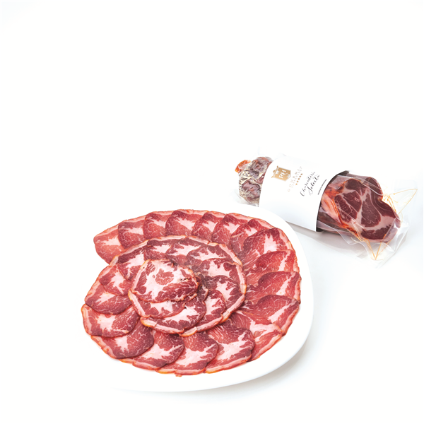 Cabezada ibérica embuchada elaborada con carne de primera calidad y que se caracteriza por su jugosidad y suave textura que le proporciona la grasa infiltrada. Es un embutido curado procedente de la aguja del cerdo ibérico, aliñado y macerado en especial naturales de primera calidad.