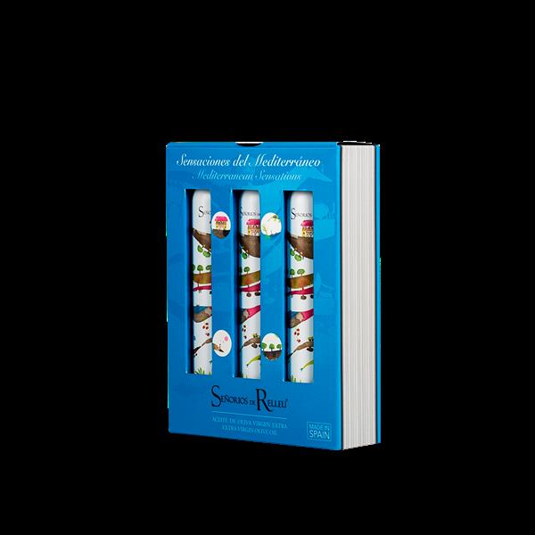 Los tres AOVES (Aceite de Oliva Virgen Extra 100 ml.) nos transmiten las Sensaciones: del mar Mediterráneo, montaña, aromas verdes, naturaleza, historia… Una edición de bolsillo especial como regalo con la esencia de las sensaciones que nos transportarán a un mundo de percepciones de mar y tierra.