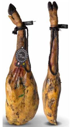 Producto elaborado con la extremidad anterior, cortada a nivel de la escápula humeral hasta el húmero radial, con mano y hueso, que incluye la pieza osteomuscular íntegra. Procedente de cerdos adultos alimentados en montanera durante 3-4 meses a base de bellotas, hierbas y rastrojos, sometida al correspondiente proceso de salazón y curado-maduración.