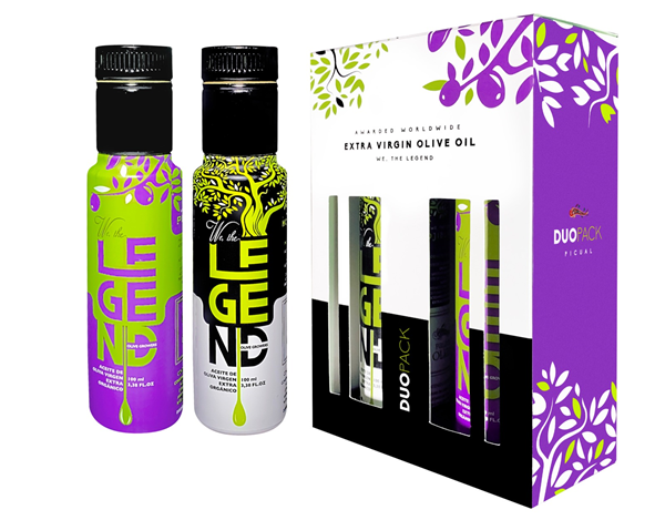 Estuche Premium DUOPACK, que contiene 2 botellas de 100ml (una picual y una hojiblanca) de aceite de oliva WE THE LEGEND.