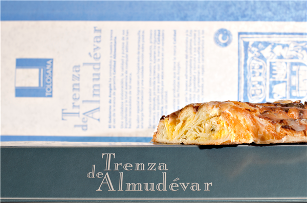La TRENZA DE ALMUDÉVAR es un brioche hojaldrado con mantequilla, relleno con una yema especial, con nueces, almendras fileteadas y pasas maceradas en ron, cocida sobre piedra y cubierta con una glasa para darle brillo y una textura crujiente.