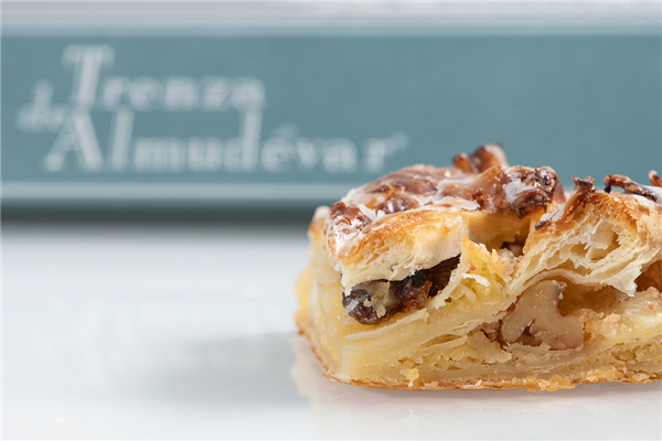 La TRENZA DE ALMUDÉVAR es un brioche hojaldrado con mantequilla, relleno con una yema especial, con nueces, almendras fileteadas y pasas maceradas en ron, cocida sobre piedra y cubierta con una glasa para darle brillo y una textura crujiente.