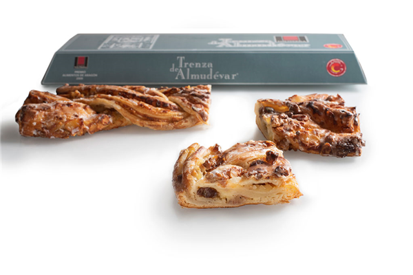 La TRENZA DE ALMUDÉVAR es un brioche hojaldrado con mantequilla, relleno con una yema especial, con nueces, almendras fileteadas y pasas maceradas en ron, cocida sobre piedra y cubierta con una glasa para darle brillo y una textura crujiente.