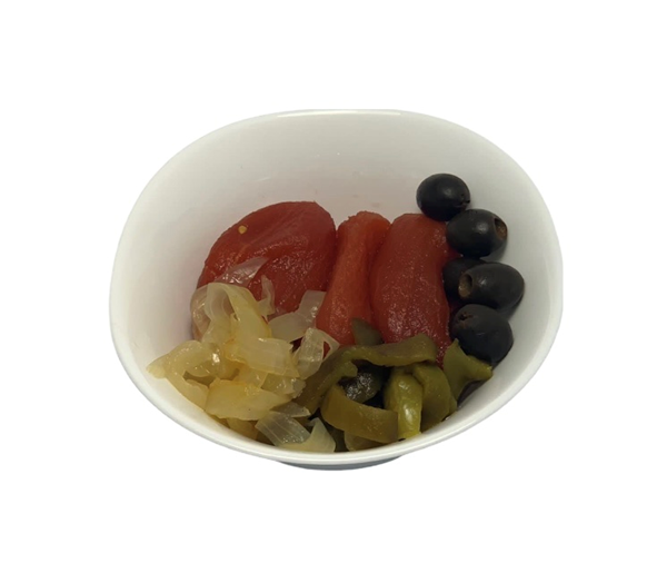 Ensalada de tomates en conserva , pimiento asado y olivas negras .