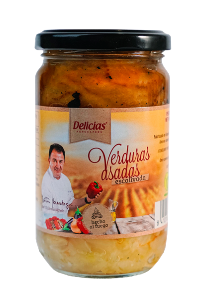 Combinación de tres verduras (pimiento rojo, berenjena y cebolla) en un asado que se mantiene su sabor y textura artesanal. Envasado en su jugo y con materias primas de la huerta mediterránea.