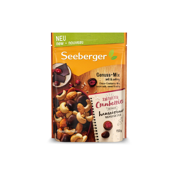 Los arándanos agridulces y afrutados de Canadá se recubren cuidadosamente con una capa crujiente de chocolate negro belga. La interacción única de arándanos negros, anacardos y miel, sal y almendras hace que Seeberger Pleasure Mix sea una experiencia de sabor especial para todos los fanáticos de las nueces y el chocolate.