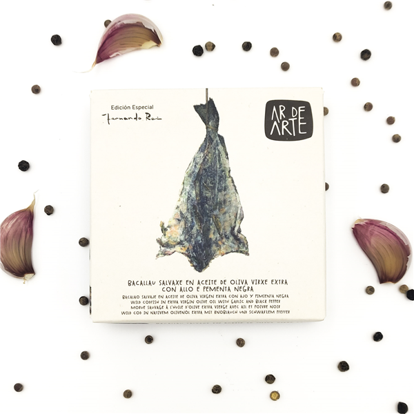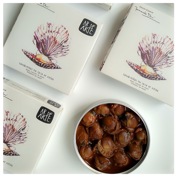 Conservas gallegas de pescados y mariscos de temporada, envueltos en obras originales de artistas gallegos.