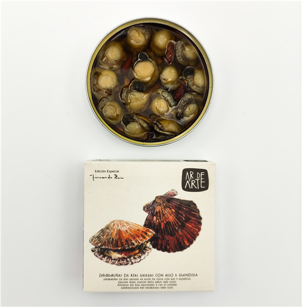 Zamburiñas de rías gallegas con ajo y guindilla en aceite de oliva.