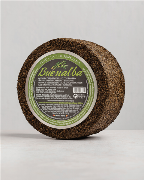 De la fusión entre los elementos de la cocina española básicos y nuestra experiencia como queseros durante más de 30 años, junto con las ganas de innovar, surgen los quesos Buenalba. Buenalba al romero en corteza es un queso elaborado a partir de leche cruda de oveja y cuya corteza está recubierta por una mezcla de romero y manteca de cerdo. Está madurado entre 10 y 12 meses en nuestra Finca en Tembleque. Al tener romero y manteca en su corteza, a pesar del tiempo elevado de maduración la textura del queso sigue manteniéndose cremosa.Sabor: Láctico y suave. Con regusto persistente.