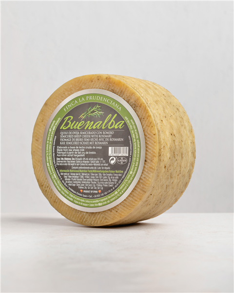 De la fusión entre los elementos de la cocina española básicos y nuestra experiencia como queseros durante más de 30 años, junto con las ganas de innovar, surgen los quesos especiados Buenalba. Buenalba al Romero es un queso artesano elaborado a partir de leche cruda de oveja y con romero en su interior. Madurado entre 3 y 4 meses en nuestra Finca en Tembleque, es un queso de pasta prensada, con marcas en corteza de la flor y la pleita.