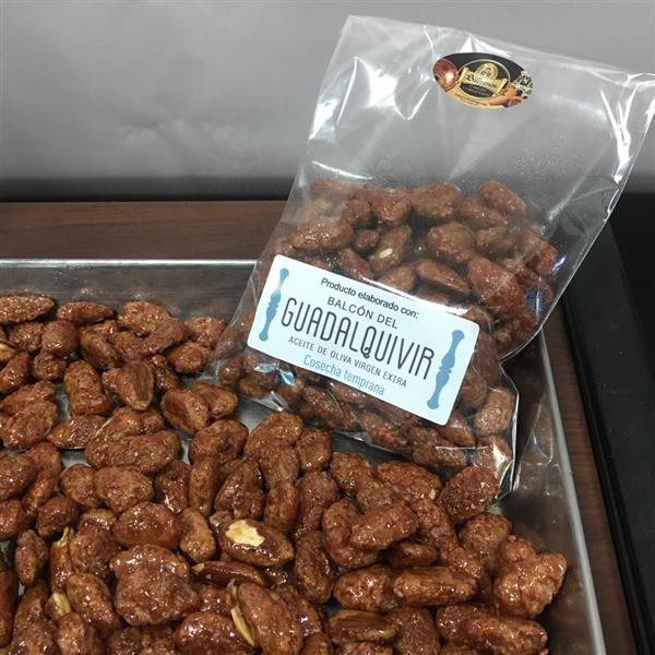 La almendra garrapiñada con AOVE se elabora a partir de almendras crudas a las que se añade un recubrimiento de azúcar caramelizado, dónde mediante el proceso manual en un perol, se hierve a fuego adecuado la almendra con el azúcar y agua, hasta que se evapora toda el agua, que es rematada “al punto” con el Aove Premium, una vez enfriada la almendra garrapiñada cuando se criba. De esta manera, los frutos secos adquieren el color oscuro típico del azúcar tostado.