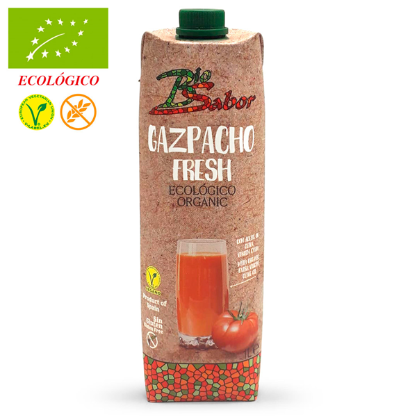 Gazpacho ecológico, fresh sin gluten. Ensalada líquida tradicional de nuestra dieta mediterránea, elaborada a base de muestras propias hortalizas ecológicas (tomate, pimiento, pepino, cebolla, ajo, vinagre y aceite de oliva virgen extra ecológico). Receta especial para celiacos, para aquellos que prefieren un sabor más suave y ligero, ideal como reconstituyente tras la práctica deportiva.