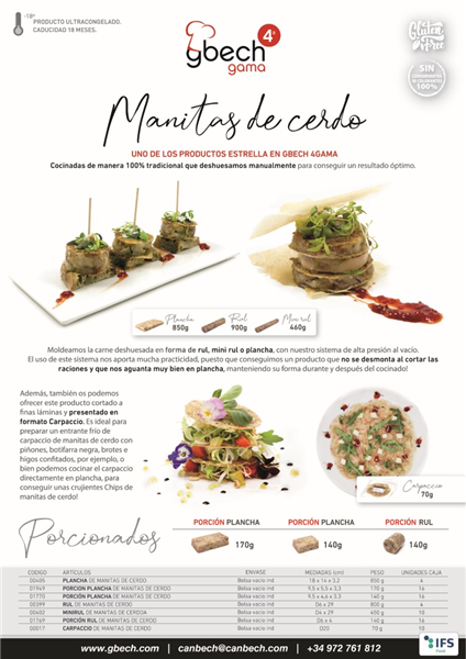 Manitas de cerdo cocinadas a baja temperatura en carpaccio o prensadas en plancha, rulo y mini-rulo.