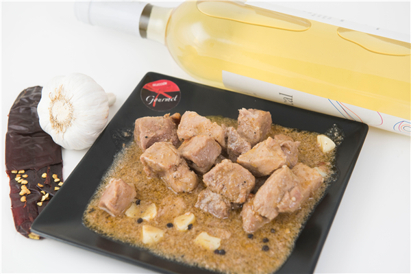 Carne de cerdo de primera, cocinada a fuego lento para obtener el resultado final de la jugosa carne al ajillo.