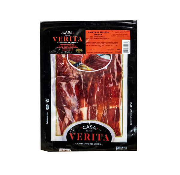 Paleta de bellota ibérica 50% raza ibérica cortada a cuchillo por expertos cortadores y envasada al vacío en sobres de 100 gr.