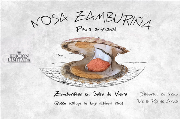 NOSA ZAMBURIÑA DE RIANXO EN SALSA DE VIEIRA PROCEDENTE DE PESCA ARTESANAL CON EL ARTE DEL "BOU DE VARA". ORIGEN CERTIFICADO DE LA RÍA DE AROUSA Y ELABORADO EN FRESCO EN EL MOMENTO ÓPTIMO DE CALIDAD DE LA AFAMADA ZAMBURIÑA DE RIANXO.