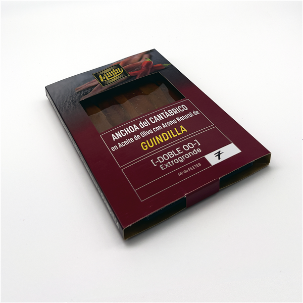 Filete de anchoa del cantábrico en aceite de oliva con aroma natural a guindilla en un formato nuevo y atractivo. Una barqueta de plástico con 7 Filetes de anchoa tamaño extra grande y un llamativo estuche con ventana.