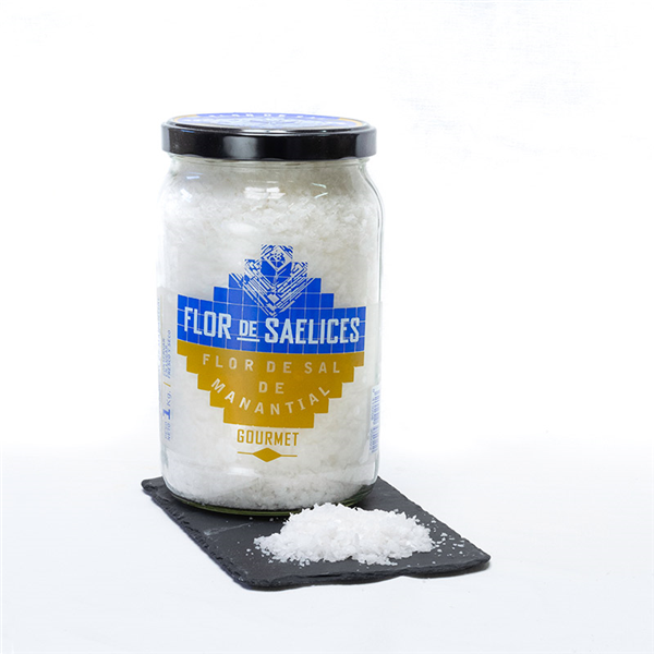 Sal de Manantial, recogida en salinas de Saelices de la Sal (Guadalajara) y por tanto está libre de micro plásticos, y metales pesados que cada vez son más comunes en las aguas marinas.La flor de sal es una capa delgada de sal que se forma en la superficie de las albercas, por contraste térmico entre la temperatura del día y la noche, debido al enfriamiento de la salmuera que reduce su solubilidad y propicia la precipitación (cristalización) masiva de pequeños cristales de sal rica en magnesio y flúor que, debido a la menor densidad que de la salmuera quedan en superficie formando una fina membrana de diminutos cristales de sal.Por su valor gastronómico y organoléptico hacen de esta sal, la sal «gourmet» por excelencia. Es recolectada según técnicas muy tradicionales y de forma artesanal.