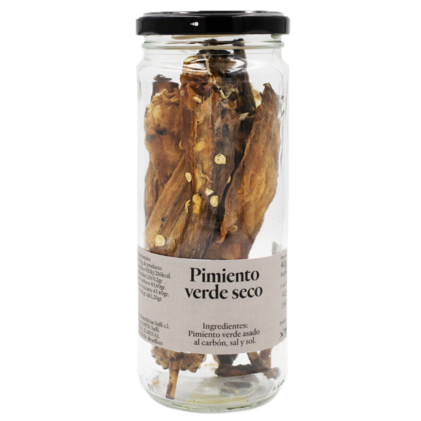 Nuestro Pimiento verde seco Desuflí es el resultado de la selección de una variedad de pimiento autóctona del levante almeriense, el Pimiento del País.Seleccionamos los pimientos cuando están en su punto justo de maduración, sin golpes ni partes dañadas, y aplicamos el proceso tradicional: se exponen al sol y al aire con un espolvoreo de sal. SOLO SOL Y SAL. El olor, junto con el color y la textura naturales, son un placer para los sentidos.
