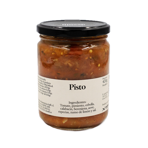 El Pisto Desuflí es la perfecta combinación de hortalizas: tomate, pimiento, cebolla, calabacín y berenjena, cuidadosamente seleccionadas y cocinadas a fuego lento empleando aceite de oliva virgen extra y una pizca de sal. Ponemos todo el cuidado a la hora de elaborar esta receta para que el resultado final sea exquisito.