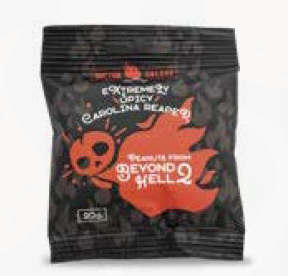 Cacahuetes de primer calidad, fritos en 100% aceite de oliva. Después añadimos una cantidad extravagante de Carolina Reaper molido y un toce de sal. Todo esto  hecho con nuestra receta  para nosotros en Frutas Secas Eyma, los mejores tostadores de frutos seco en España. "Comprando estos cacahuetes significa que estas notificado que son DEMASIADO picantes, y Salsas Y Especias Sierra Nevada SL no tiene responsabilidad por lo que pasa cuando abras esa bolsa."