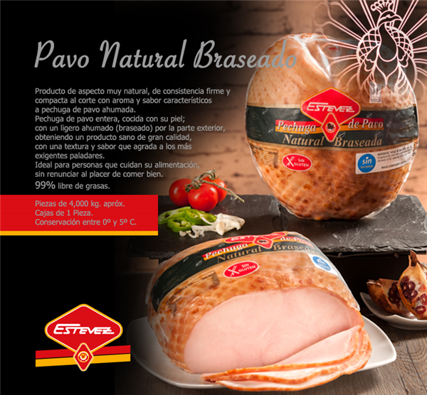 Producto de aspecto muy natural, de consistencia firme y compacta al corte con aroma y sabor característicos a pechuga de pavo ahumada.Pechuga de pavo entera, cocida con su piel; con un ligero ahumado (braseado) por la parte exterior, obteniendo un producto sano de gran calidad, con una textura y sabor que agrada a los más exigentes paladares.Ideal para personas que cuidan su alimentación, sin renunciar al placer de comer bien.99% libre de grasas.