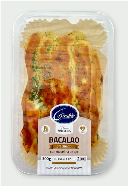 Tajada de bacalao confitada y cubierta con una fina muselina de ajo gratinada. Receta marinera realizada con auténtico bacalao Gadus morhua y una selección de los mejores ingredientes. Suave y delicioso