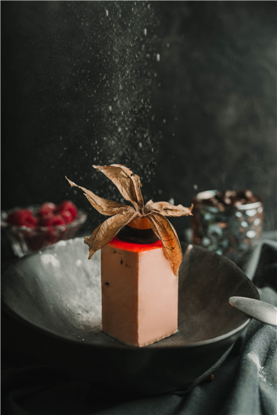 Helado sabor a mandarina con núcleo de chocolate y coronado con physali cubierto de chocolate