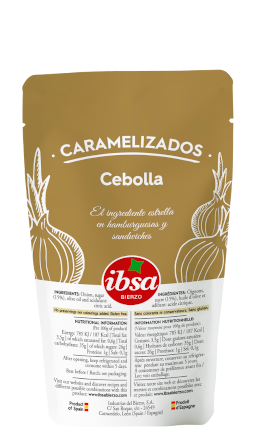 La cebolla caramelizada Ibsa se elabora a partir de cebollas frescas, peladas y picadas en trozos de 14x14mm, caramelizadas con azúcar y aceite de oliva a fuego lento, durante el tiempo necesario hasta obtener un producto final de textura y sabor característicos. Te sugerimos que tomes esta cebolla caramelizada como guarnición en carnes, aves, pescados y otras verduras fritas o a la plancha. Es el “toque” ideal en tostadas con foie, queso... ¡Inventa tu receta!