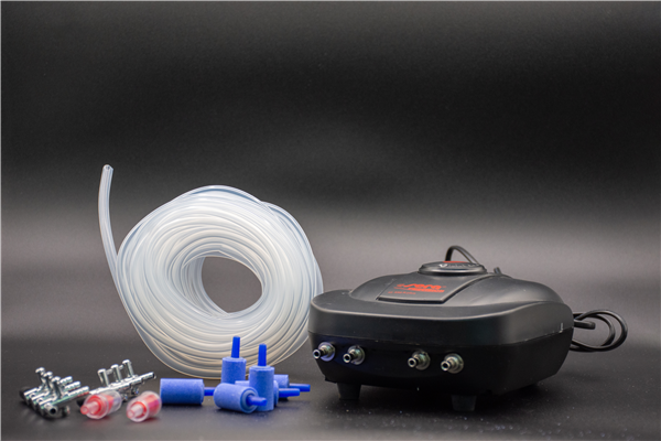Kit formado por una bomba de aire y los componentes necesarios para suministrar ese aire desde la bomba a los cultivos, pudiendo así airear y agitar el cultivo de espirulina. Apto para uso alimentario.