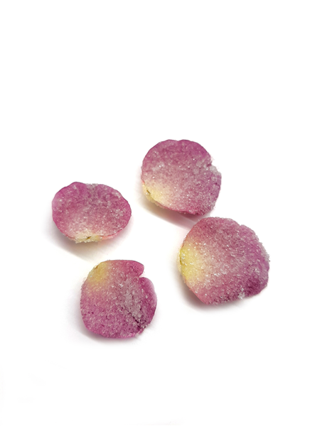 Pétalos de rosa cristalizados. De color rosa y sabor a fresa y rosa. Ideales para utilizar en postres, yogures o incluso solas. Son deliciosos con un bombón de chocolate o un helado de limón.