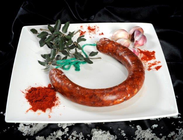 Chorizo artesanal 100 % natural. Elaborado a base de carne escogida de cerdo ibérico, sal, pimentón de La Vera y ajo fresco.