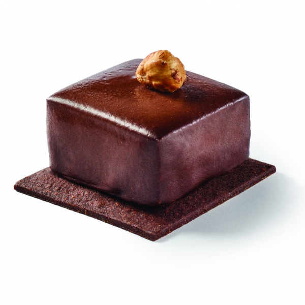 Pasta sablé de chocolate elaborado con harina de garbanzo, harina de arroz y azúcar de flor de coco. Galleta sin harina tipo brownie. Chocolate cremoso con azúcar integral y glaseado de chocolate 73%.