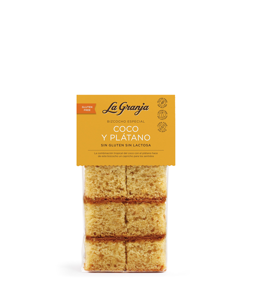 Bizcocho Especial de Coco y Plátano sin gluten, sin lactosa, sin proteína de leche de vaca y libre de maíz. La combinación tropical del coco con el plátano hace de este bizcocho un capricho para los sentidos. Certificados por la Asociación de Celíacos de Catalunya, miembro de la AOECS.