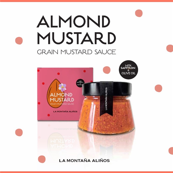 ALMOND MUSTARD es una mostaza elaborada artesanalmente con mas de 10 ingredientes; la base son los granos de mostaza amarilla que combinados con especias como el curry o la canela y mezclados con almendra picada, azafrán y aceite de oliva hacen que sea una mostaza con una consistencia y una textura muy peculiar.
