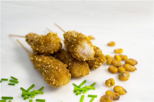 Sencillamente un langostino fresco, con una cobertura de maíz tostado y molido. Toda una mezcla de texturas y sabores suaves y crujientes a la vez que lo convierte en un bocado inolvidable.