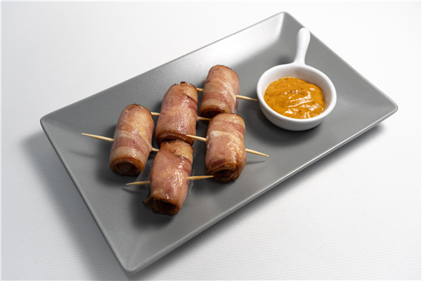 Una pequeña salchicha envuelta en una tira de bacon, una combinación sencilla y deliciosa, muy jugosa, suave y de sabor intenso y sabroso.