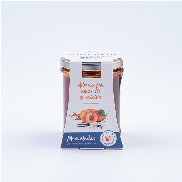 MERMELADA DE ALBARICOQUE Y AMARETTO: Combinación de la acidez y frescura del albaricoque con el amargor típico del amaretto (licor de almendra amarga). Ideal para quesos, tanto curados como frescos a la plancha, y productos del pato (foies, maigret, confit) y otras aves.