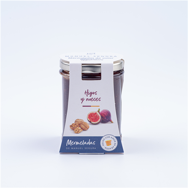 MERMELADA DE HIGOS Y NUECES. Ideal para acompañar tostadas y bollería fresca. Como complemento a yogures naturales y para elaboración de postres. Contenido mínimo de fruta, 65 %.