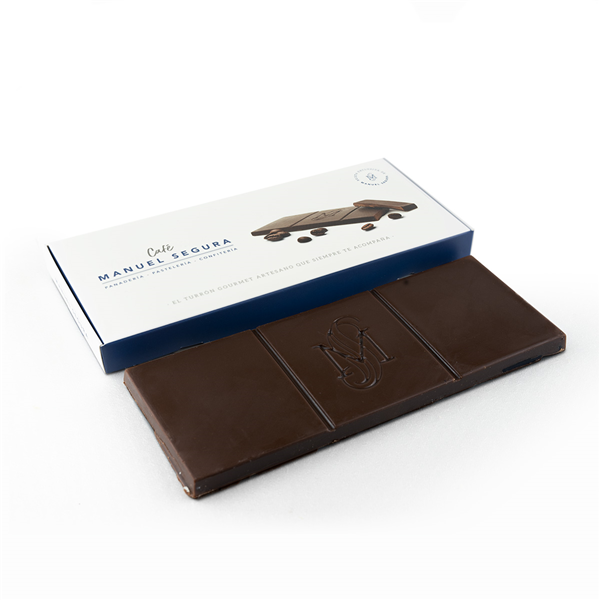 TURRÓN DE PRALINÉ CON CAFÉ: Praliné de café. Un fino praliné de almendra y chocolate negro y con leche refinado para obtener una cremosa capa de praliné y aromatizado con café molido de tueste natural, recubierto con un fino chocolate negro de 70% de cacao.
