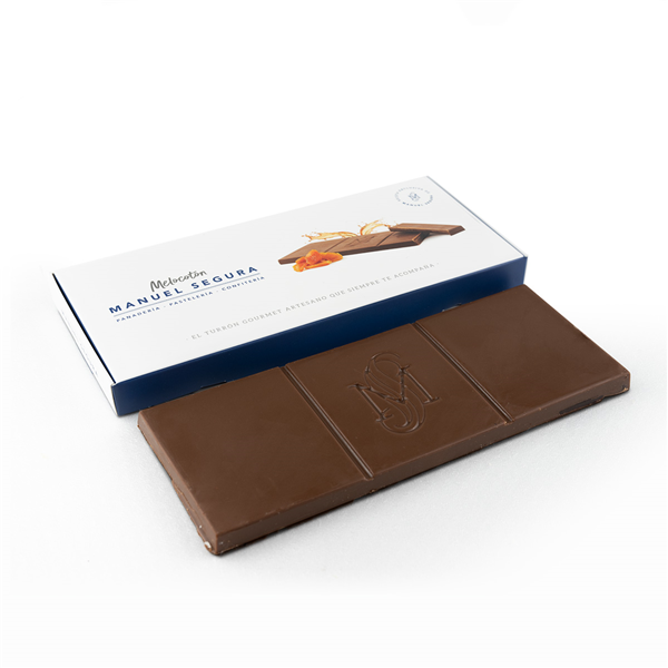 TURRÓN TRUFADO DE MELOCOTÓN: Un suave trufado de chocolate con leche y licor de melocotón envuelve los orejones macerados en licor cubierto con chocolate con leche