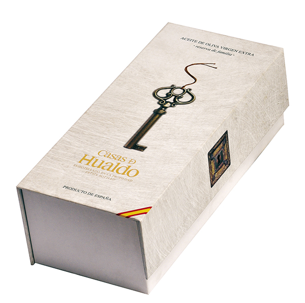Estuche forrado en cartón compacto, plastificado, hot stamping, barniz UV, con soporte interior para una botella de aceite.