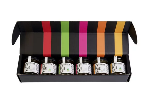 Pack degustación que incluye una selección de nuestras variedades más significativas en tarros de 45g, perfecto para disfrutar de una cata de mieles diferentes o para hacer un regalo muy especial.