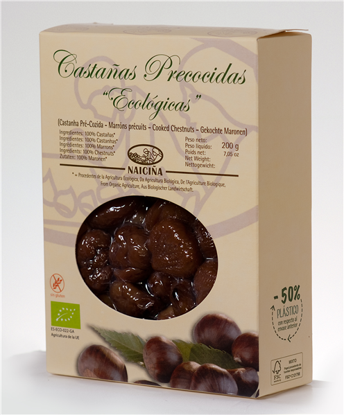 100% Castañas (Castanea sativa), cocidas al vacío. Certificación ecológica CRAEGA