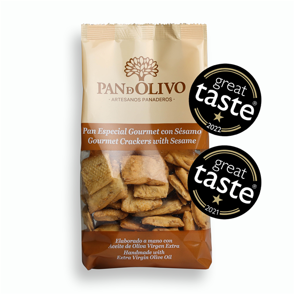 Pan especial gourmet crujiente elaborado a mano con 12% de Aceite de Oliva Virgen Extra y Sésamo Dorado. Ideal para tapear con Ibéricos, Quesos, Foie, patés o simplemente solas.